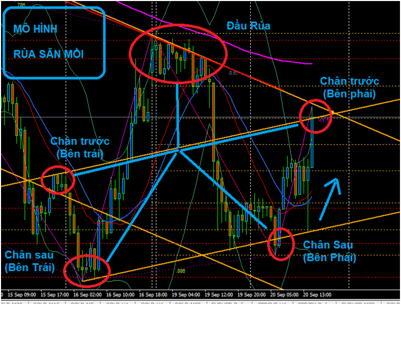 – Rùa vờn bóng: Khi chân trước phải của mô hình Rùa vượt qua khỏi đỉnh của chân trước trái và mốc giá đó gần bằng đỉnh của đầu Rùa. Với mô hình này khi chân phải hình thành gần ngay đầu Rùa thì chân rùa sẽ phải điều chỉnh tức móng Rùa phải giảm co về lại gần bằng chân trái trước của Rùa. Trước khi biến thành Rùa vờn móng nó chính là mô hình Rùa hoàn chỉnh (với chân phải trước phóng đi quá mạnh). Chúng ta sẽ BUY khi bắt đầu hình thành mô hình Rùa hoàn chỉnh, nhưng giá nó vượt qua sự mong đợi của chúng ta (vùng ngang bằng với chân trước bên trái), tiến hẳn về gần giá ngay đầu Rùa. Khi ấy chúng ta chốt BUY ngay và SELL ngược lại. Điểm SL chính là mức cao nhất của đầu Rùa (+ 1usd = Độ nảy Market), Và điểm TP chính là vùng giá của Chân trước Trái của mô hình. Sở dĩ gọi là Rùa Vờn bóng là vì sau khi giá bằng chân trước trái, Rùa cố vươn lên tạo 1 cái bóng giả để rồi trả lại bằng với giá của chân trái trước. Mô hình này còn có một điều đặc biệt là nó thường xuất hiện và một khi chân phải trước tạo bóng 1 lần thì khả năng tăng tiếp là rất cao