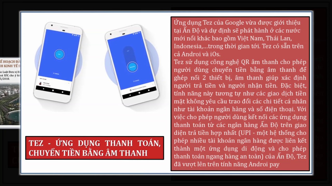 - Ứng dụng Tez của Google vừa được giới thiệu tại Ấn Độ và dự định sẽ phát hành ở các nước mới nổi khác bao gồm Việt Nam, Thái Lan, Indonesia,…trong thời gian tới. Tez có sẵn trên cả Androi và iOs.